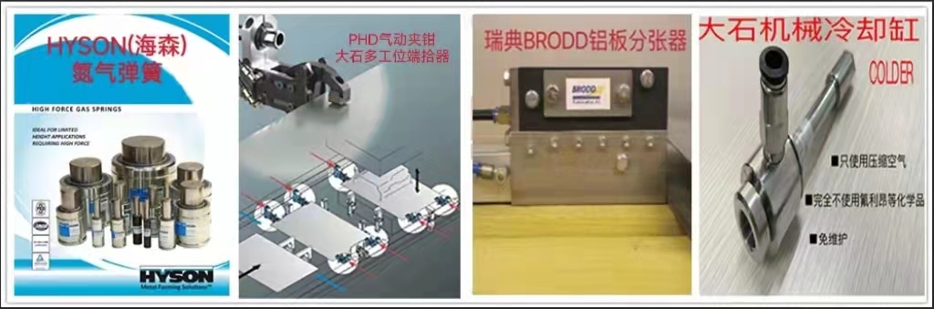 本公司是HYSON氮氣彈簧在中國的總代理,并提供管路設計及售后服務。同時還代理美國PHD氣動夾鉗、SWEDEN機器人平衡缸、美國LSP噴涂系統、法國PRONIC模內攻絲機等。另外,本公司還提供多工位模具自動化端拾器產品,從設計、制造、運輸、安裝、調試為客戶提供整套“交鑰匙”工程。